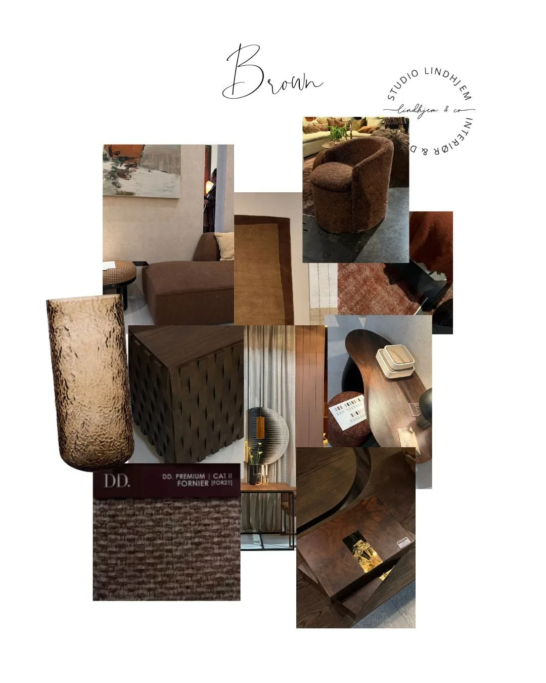 Brunt blir den nye sorte. Vi forlater beige, hvit og sort interiør og ser nå mer over til brunlig og jordlige toner. Vi kommer til å ta inn mer av mørkebrunt treverk, gjerne i farger som går mot mocca og nøtteaktig og varme toner som ikke har for mye sort. Vi ser mot grønt, rødt, gult som beveger seg mot det brune og varme som oker, rust, terracotta og oliven. Alle bildene er tatt fra messen og satt sammen i fargekategoriene.