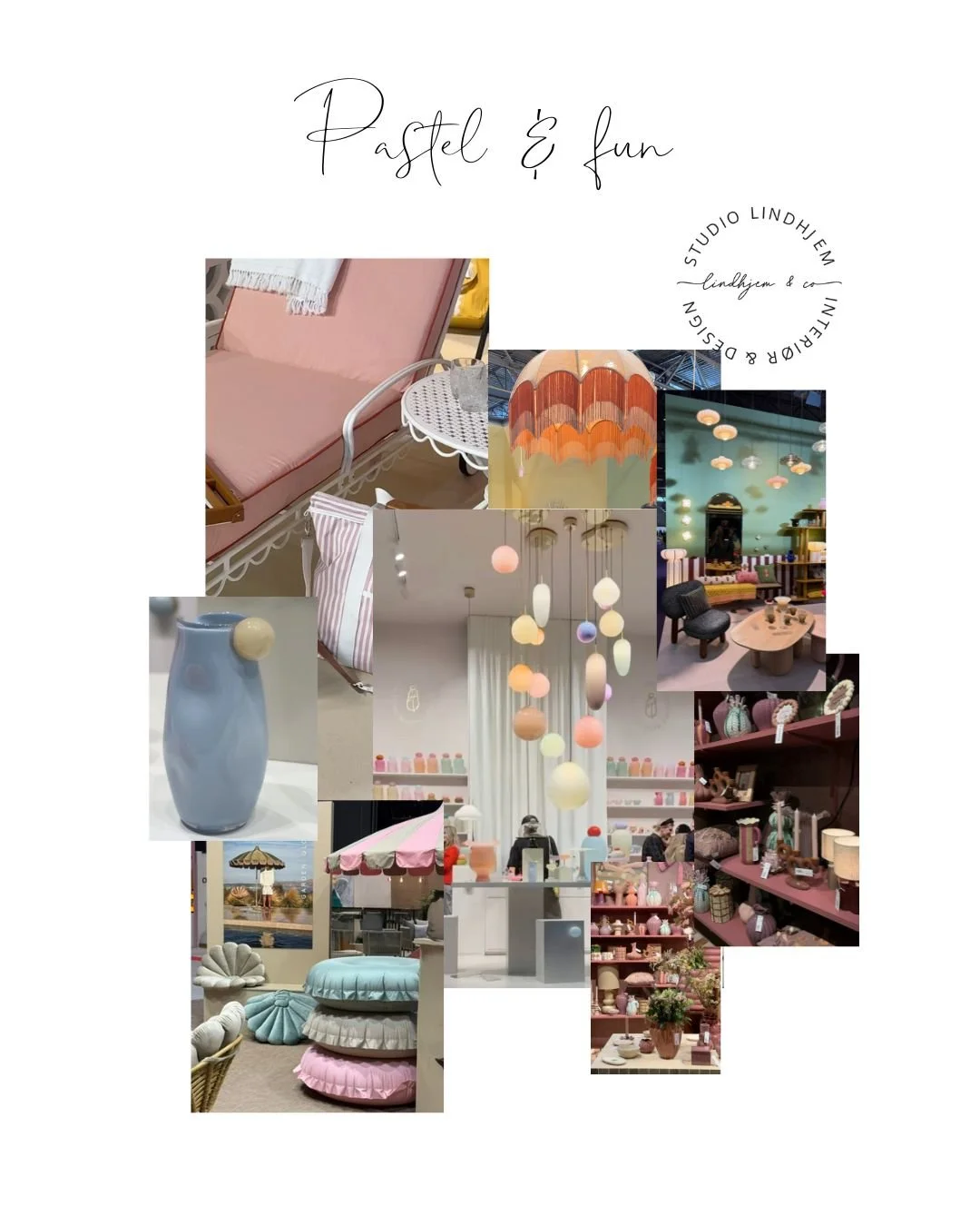 Pastell i rosa, grønt, gult og blått og morsomt interiør. Lekent interiør på både vaser, lysestaker lamper og dekor.
